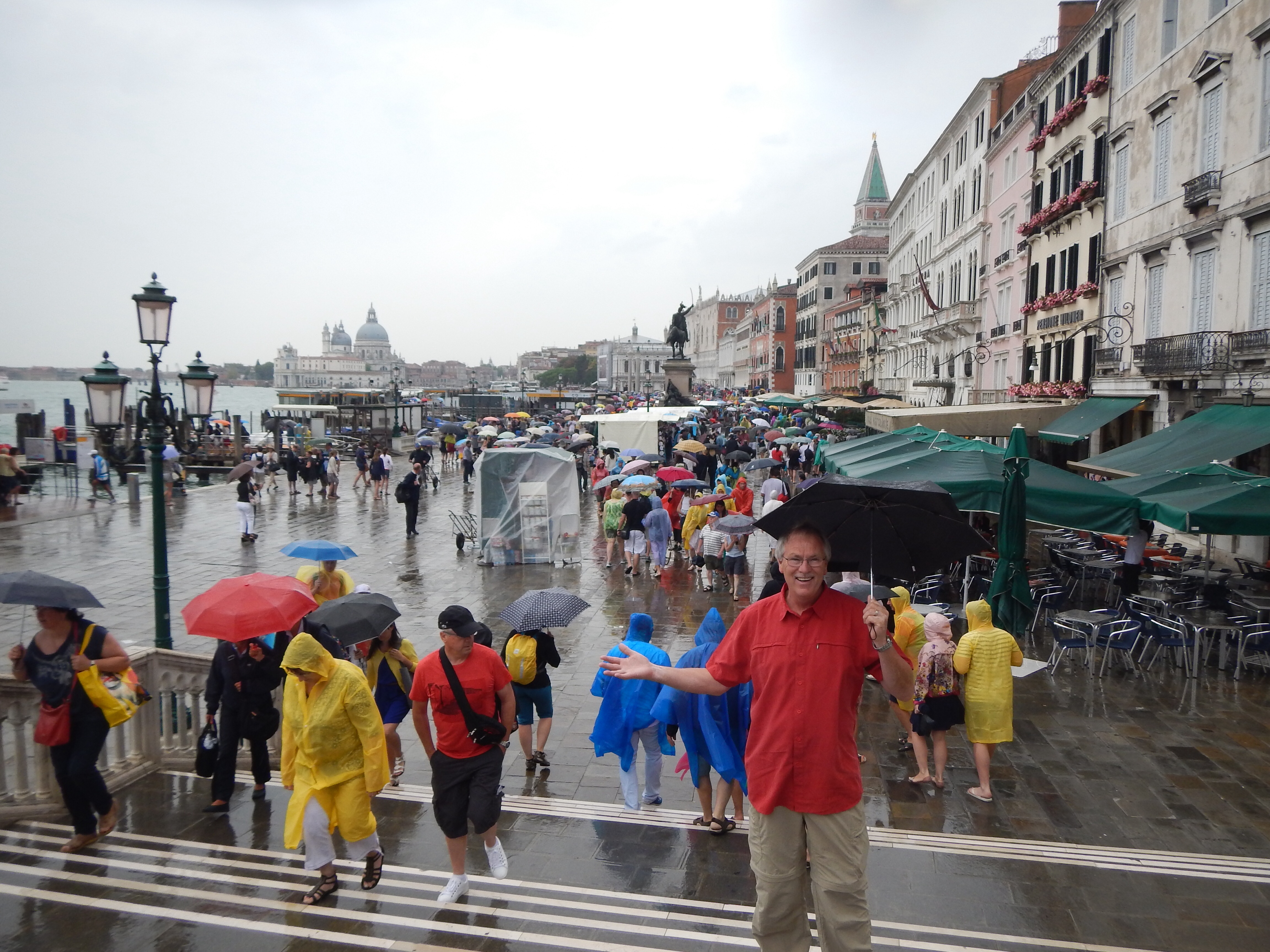 We lucked into a great campsite on the peninsula across from Venice in a place called Punta Sabbioni. We bought a metro transit pass for the bus-like ferry system and have spent the last four full days exploring Venice and Islands. You cannot help but be impressed with this place, it really is magnificent and romantic too, if you don’t mind sharing it with a few others. When Bert and I were here in the fall of 72 the streets were mostly empty with the exception of a few guys selling freshly roasted chestnuts. Today, Venice reminded me of a busy shopping mall in Edmonton on the 24th of December minus the panic purchasing. Margot really enjoy all the Murano glassware shops and I enjoyed the air conditioning they provided. Despite the large crowds of international tourists and all the street sellers trying to earn a living, it really is a very impressive and exciting place to be that we’ll always remember with fondness. And then the rain… on wash day!